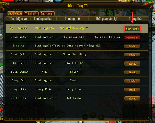 Sau khi Thần Tướng hoàn thành nhiệm vụ được giao, anh hùng nhấn vào nút “Nhận Thưởng” để trả nhiệm vụ và nhận phần thưởng.