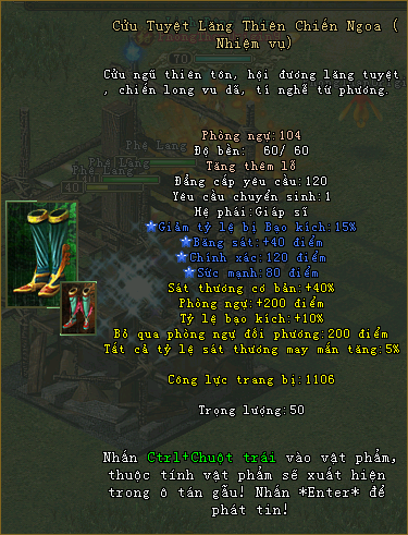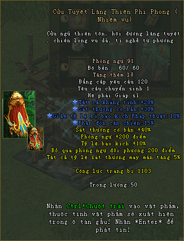 Trang bị Hoàng kim là bảo vật mà chỉ các bậc anh hùng chân chính mới xứng đáng sở hữu. Phong Thần Origin lần đầu tiên giới thiệu 3 bộ trang bị Cửu Tuyệt, Thiên Thù, Vô Tần với các chỉ số và thuộc tính mạnh mẽ giành riêng cho mỗi hệ phái. Hãy tham gia ngay để sở hữu bộ trang bị Hoàng kim và khuynh đảo tam giới.