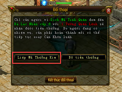 Khi tham gia xoay càn khôn anh hùng còn có cơ hội nhận được nhiệm vụ ẩn Liệp Mã Thưởng Kim. Hoàn thành nhiệm vụ này sẽ giúp anh hùng nhận được rất nhiều ngân lượng.