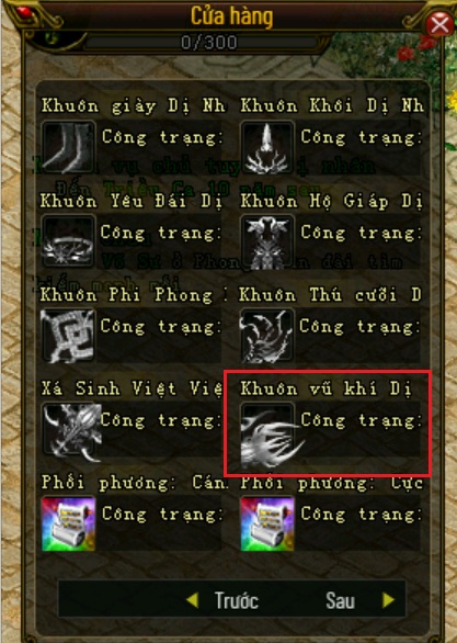 Khuôn vũ khí + 50 Tướng Quân Lệnh + 100 Nhân Hồn Tinh Hoa + 100 Địa Hồn Tinh Hoa + 100 Thiên Hồn Tinh HoaCông thức hợp thành Vũ khí Thượng Cổ: