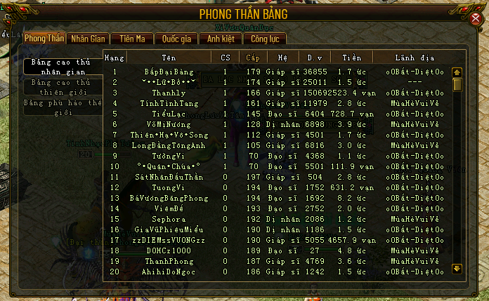 Như vậy sau hơn 1 tháng tranh tài, hoạt động đua TOP của máy chủ Đông Hải cũng đã kết thúc. Cảm ơn quý anh hùng đã tham gia hoạt động lần này, dưới đây là kết quả đua TOP cuối cùng được bổn pháp ghi nhận.