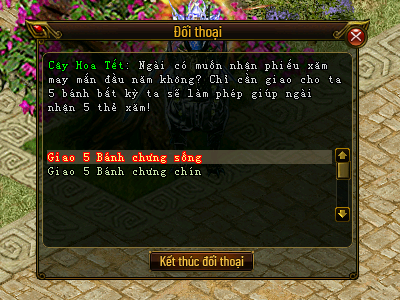 Anh hùng tới chỗ Cây Hoa Tết và giao nộp loại 5 bánh bất kỳ sẽ có cơ hội nhận đc 5 Thẻ Xăm 2024. (Nộp bánh chín chắc chắn nhận được)
