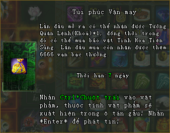 Lần đầu mở túi Phúc Vận May mỗi ngày sẽ nhận được phần thưởng 01 Tướng Quân Lệnh (Khóa).