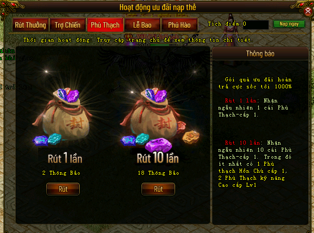 Kỳ mới của hoạt động siêu ưu đãi Nạp thẻ đã đến. Anh hùng nạp thẻ trong dịp cuối năm này có cơ hội rút thưởng vô số bảo vật quý như Vũ khí Truyền Thuyết, Pháp bảo Bản giới hạn, Trăn Phẩm Thạch, tham gia ngay!